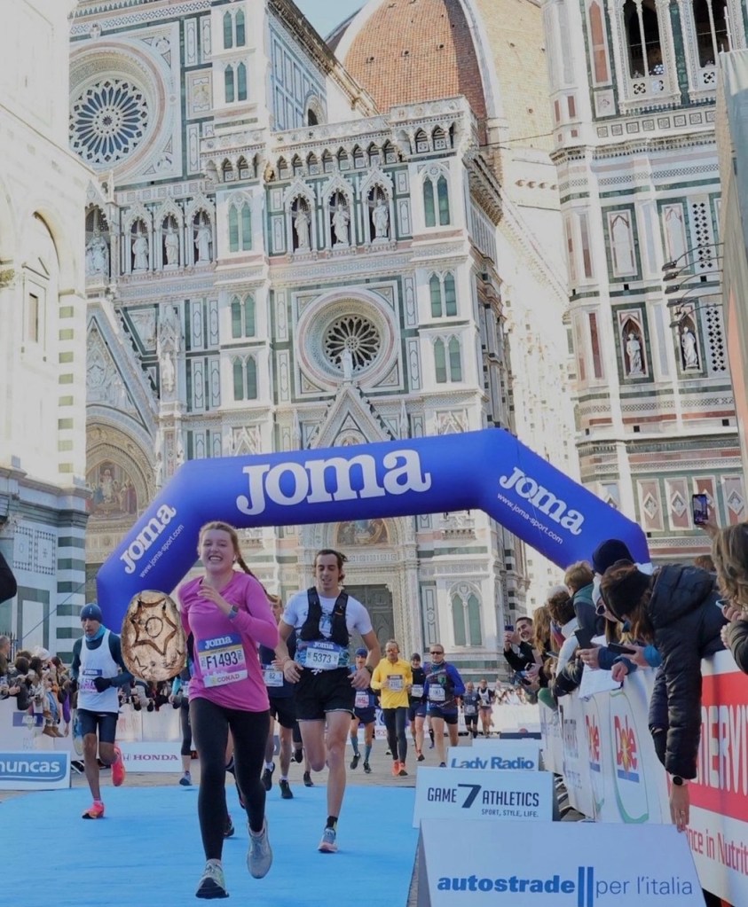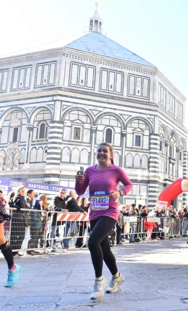 One week before the Florence marathon, I caught wind that some other students in my program were participating. Without much thought (or consideration for running a marathon on cobblestone streets), I signed up! After landing in the Florence airport from a weekend trip at 12:00am, I woke up at 6:00am ready to run. As I made some pre-race breakfast of peanut butter on sourdough bread, I felt a hint of my previous running mentality fogging my brain – How could I run a whole marathon when I had no regimented training? However, my sourdough bread (covered in peanut butter) caught my eye. With a growing smile, I started to dance as I headed toward the starting line at the famous Duomo. I ran the whole marathon with a giant smile on my face, happy to be there and grateful for everything running has given me.